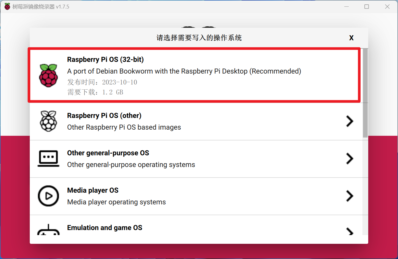 选择要烧录的系统,推荐选择第一个系统,这个系统可以适配树莓派的所有型号